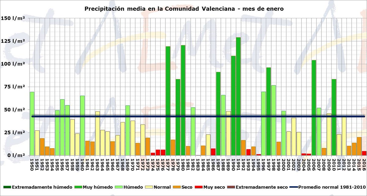 Pel que fa al territori valencià, i segons les dades publicades per AEMET, gener ha sigut un mes extremadament càlid (+2,7º respecte a la sèrie, el més càlid des de 1955) i molt eixut. Només els 16 i el 17 va fer "un poc" de fred.
