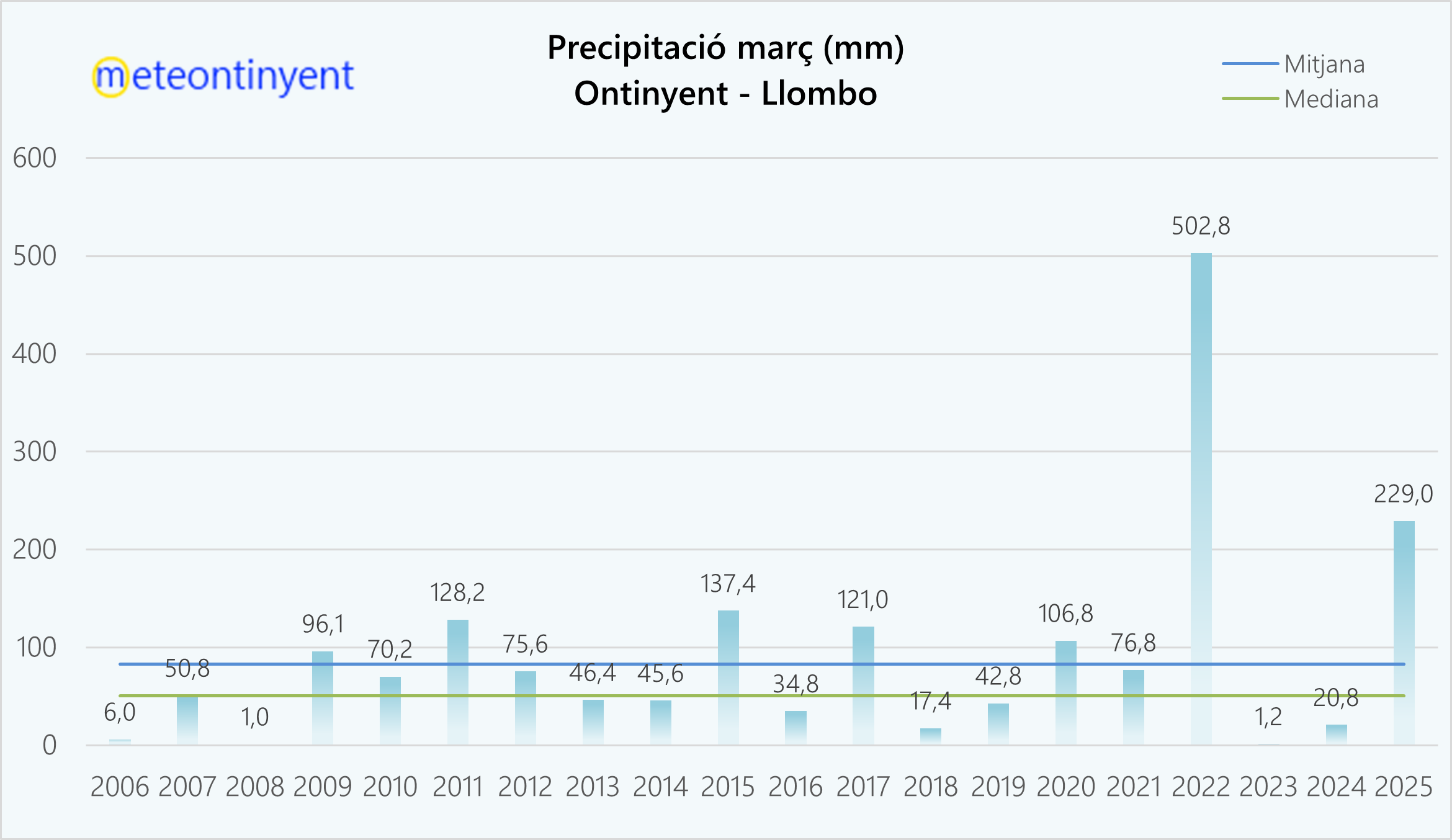 - Amb 229 mm recollits, ha sigut el segon març més plujós no només de la sèrie de l’estació del Llombo, sinó també de la centenària sèrie de l’observatori oficial d’Ontinyent. No se superaven els 200 mm mensuals des de maig de 2023. Ha plogut en 18 dels 31 dies del mes.